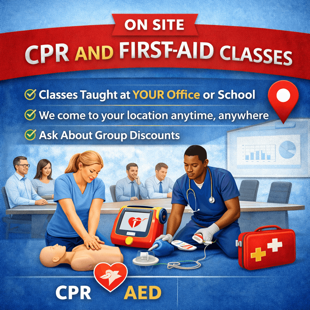 Safety Training Seminars makes it easy to train your entire team on-site. We can come directly to your office, school, business, or organization to provide professional CPR, AED, and First-aid training for your staff in a convenient group setting.